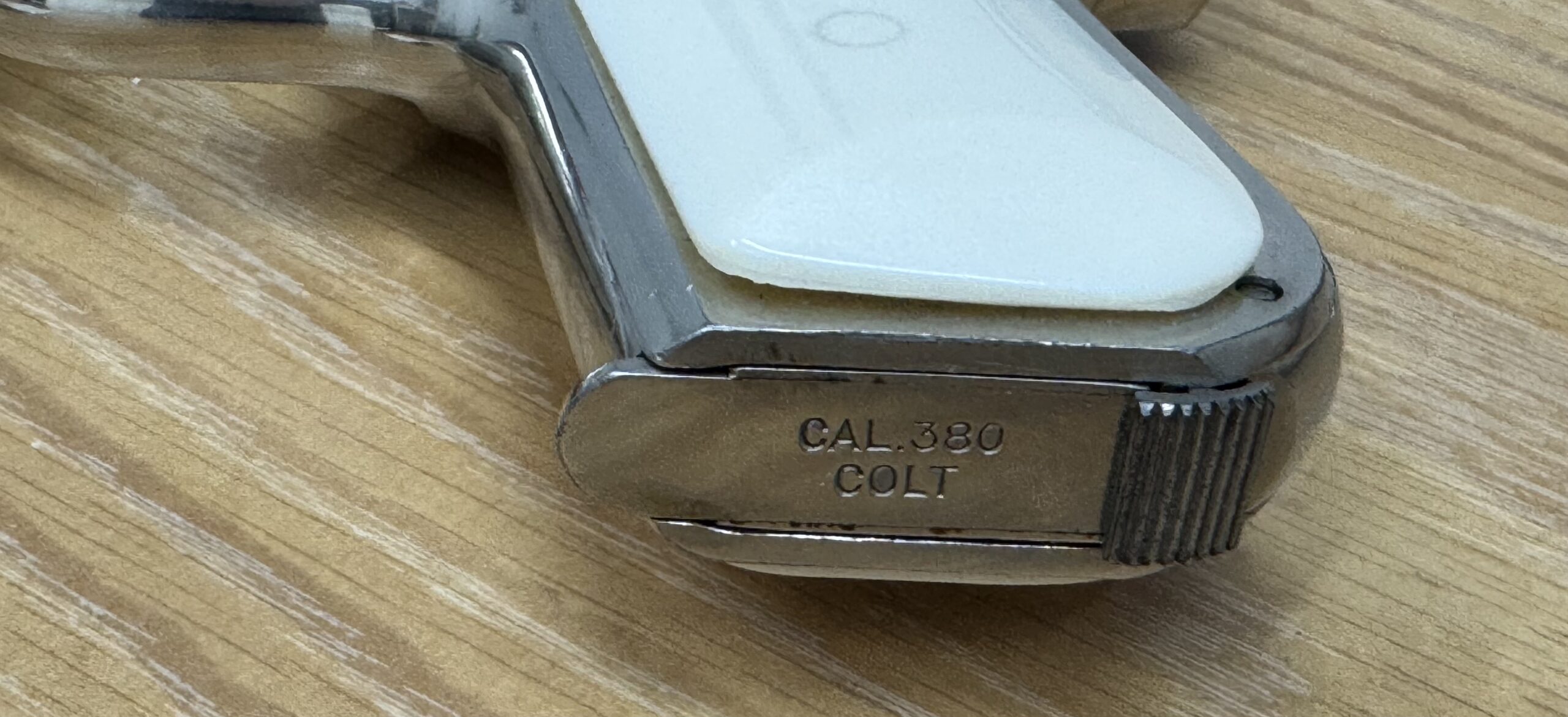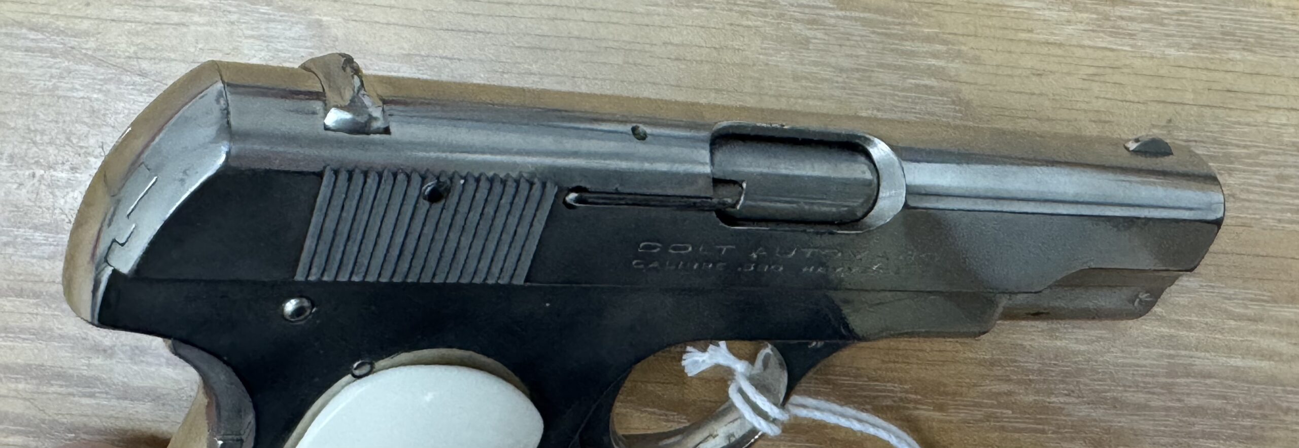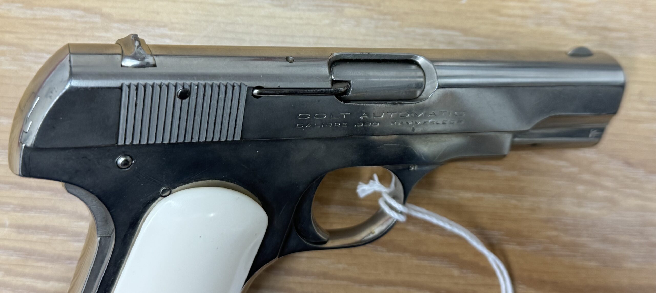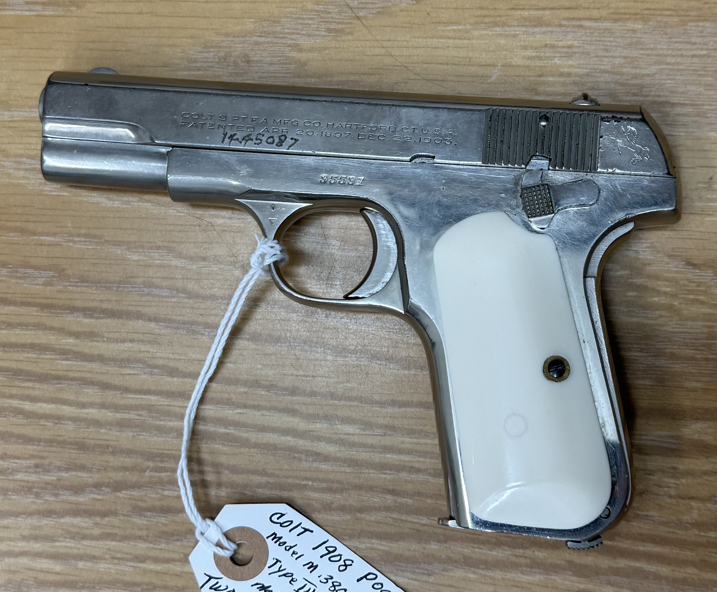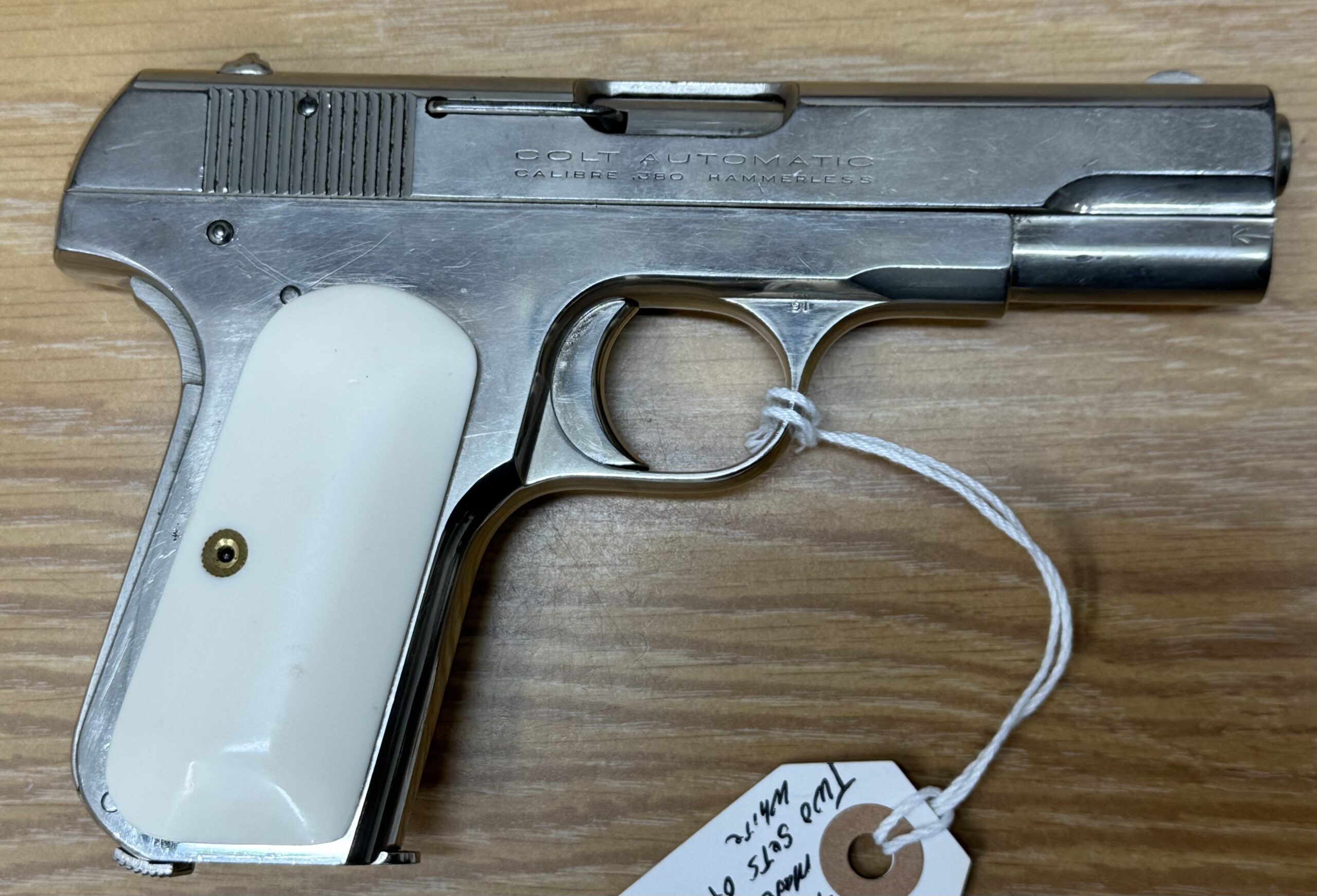 Consignment Colt 1908 380. Nickel with faux ivory grips and a spare set of checkered faux ivory. Has a number etched in left side of slide. 1929 production, according to the Colt website. Price is firm as it is a consignment item. I will be glad to pass offers to the owner.