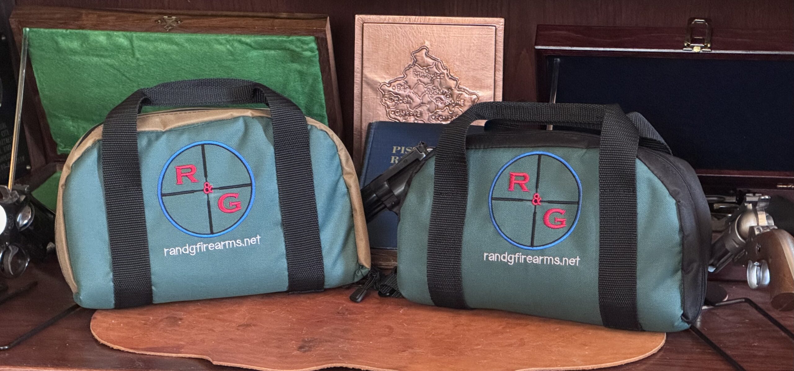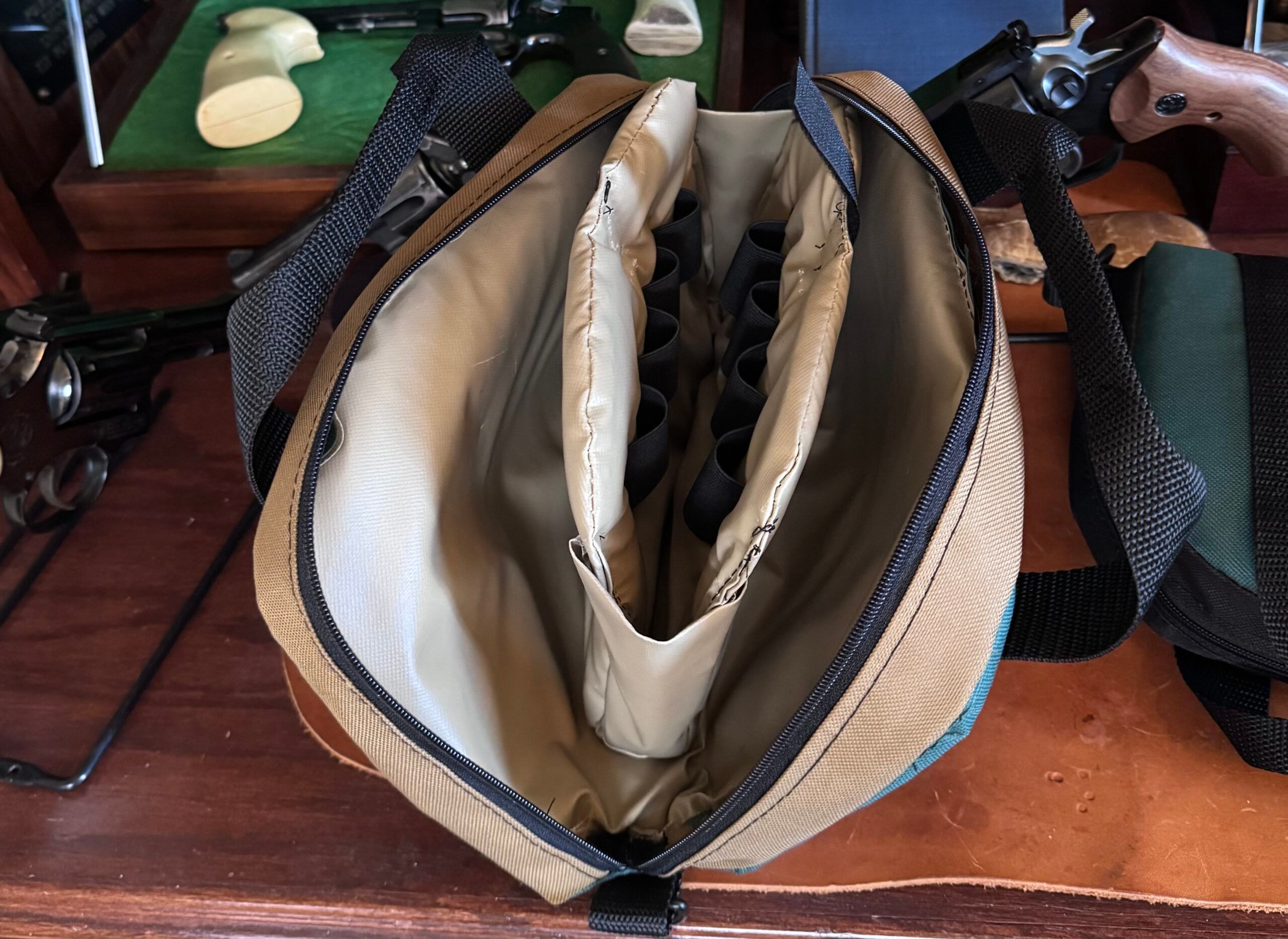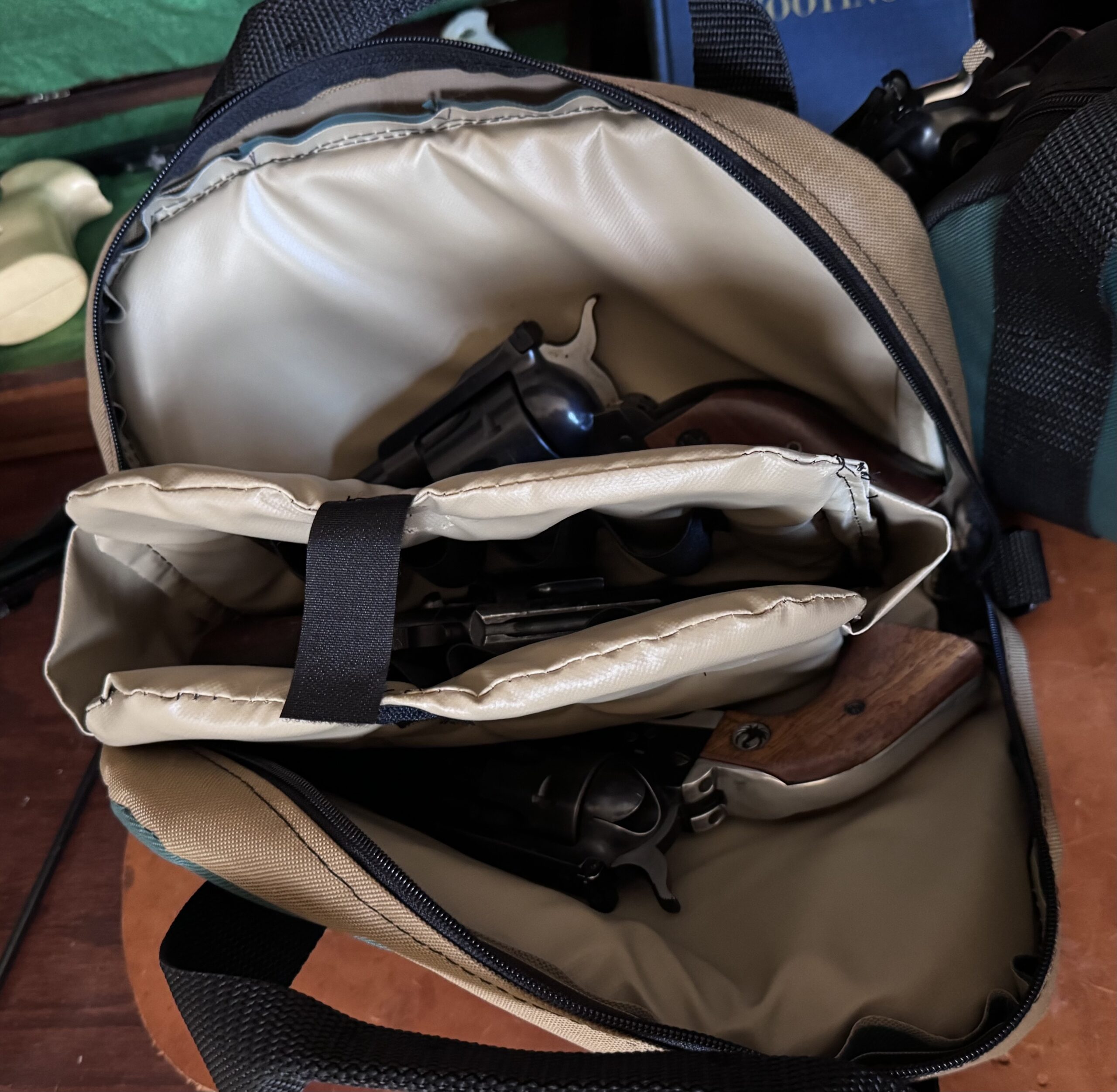 Made in Oklahoma by a friend. I have been using this bag for several years. It has three compartments spearated by padded walls. Center compartment has magazine loops. I have carried 3 n frame revolvers or Ruger Blackhawks with up to 5.5″ barrels. $45