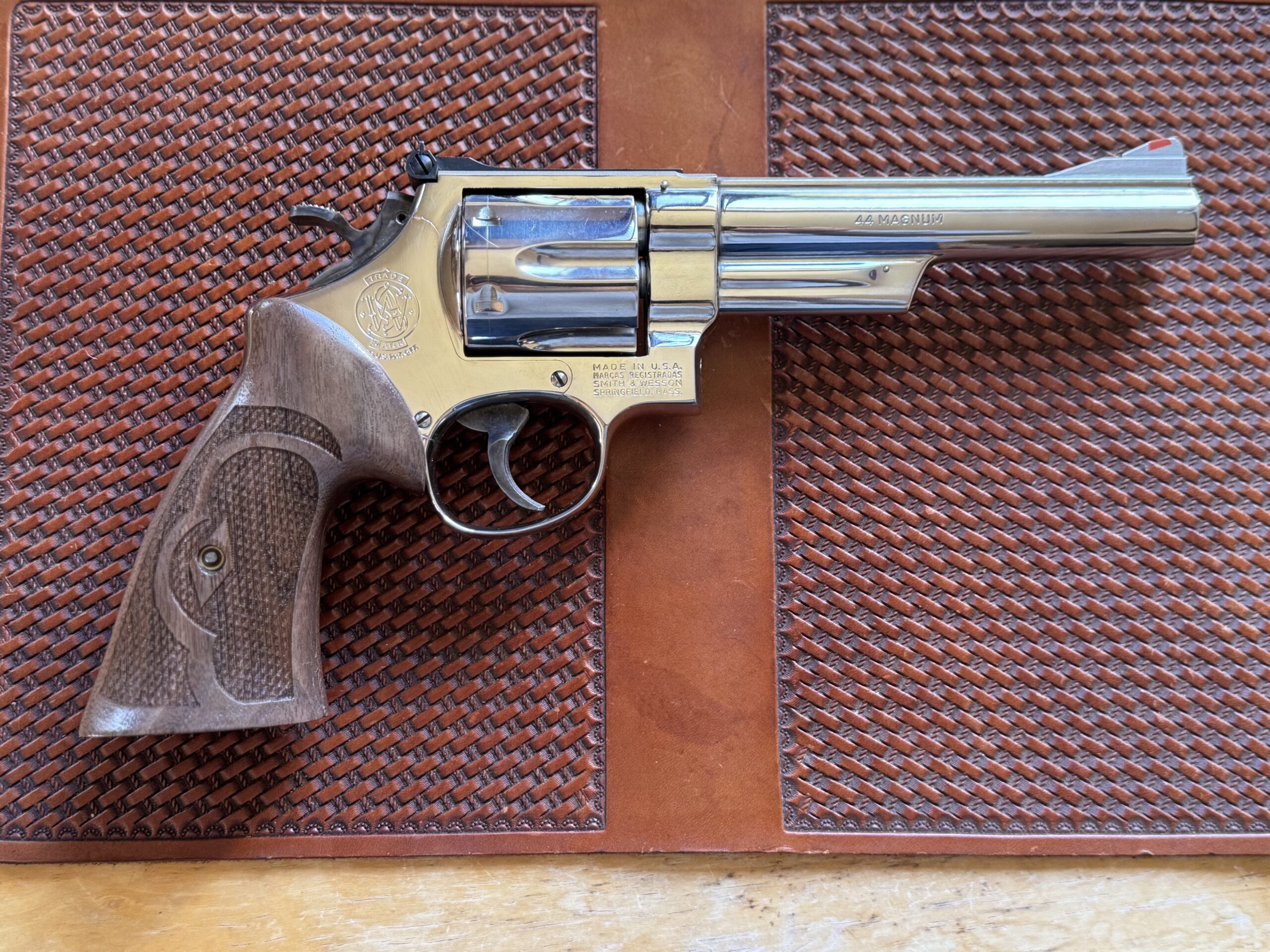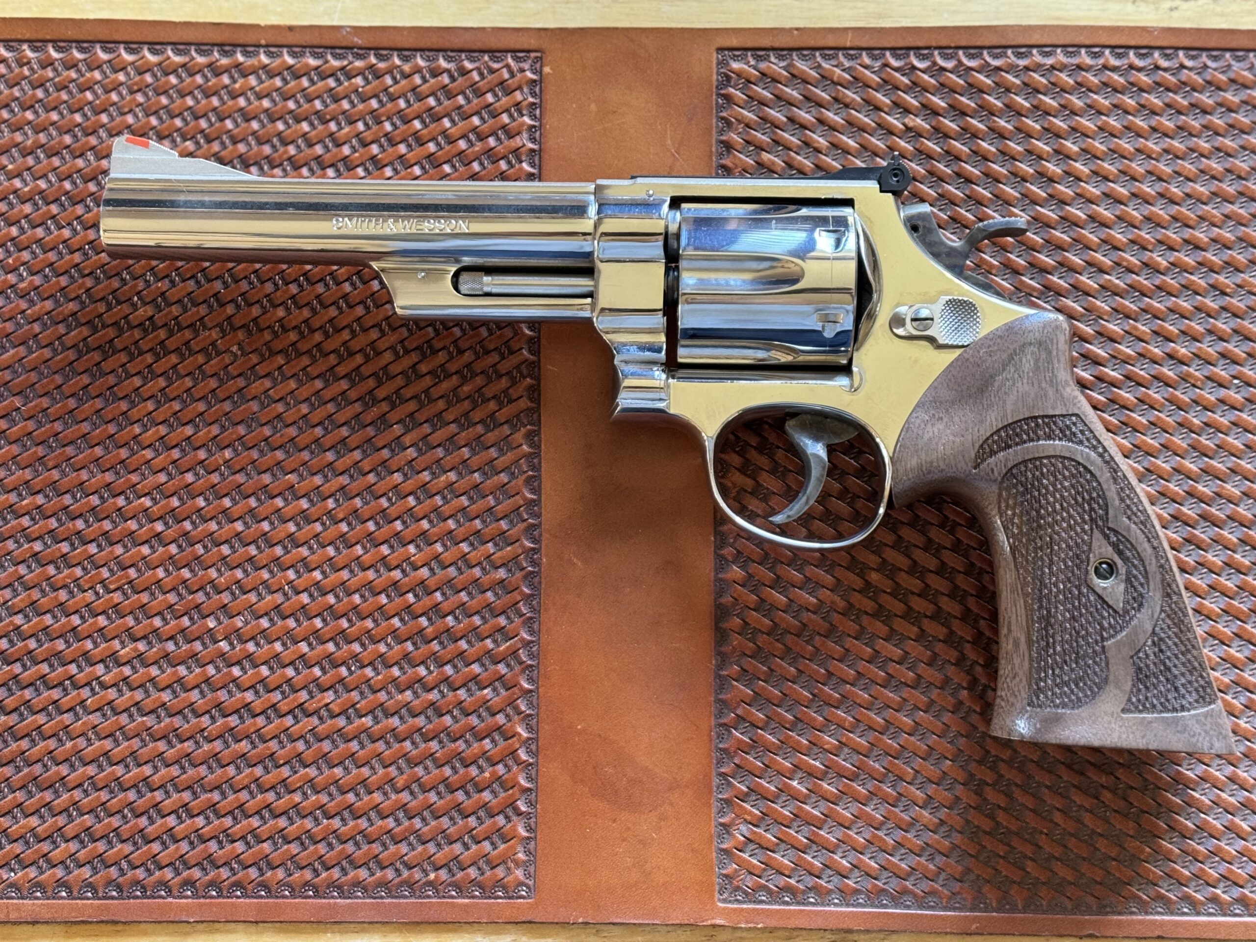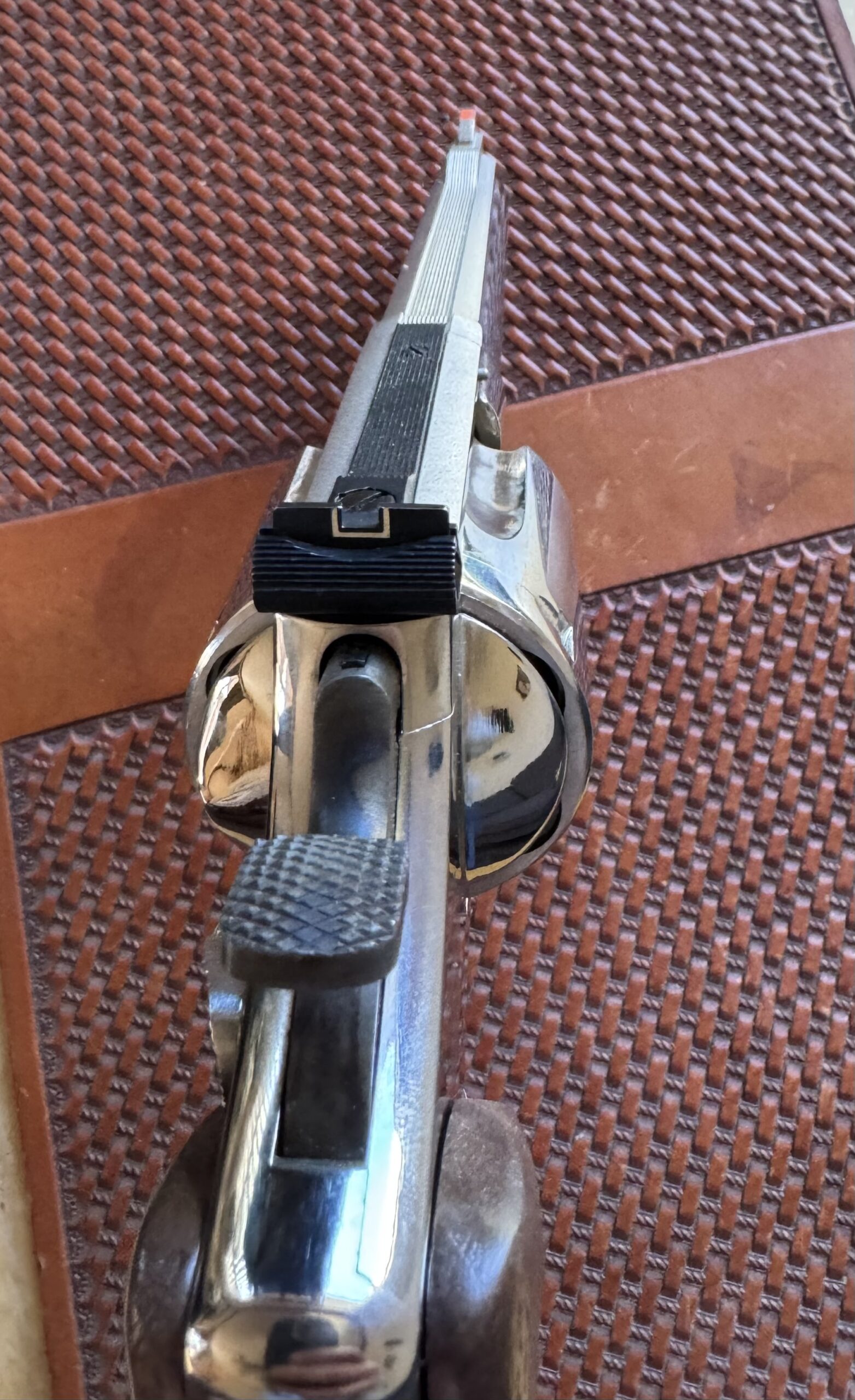 Very nice used 6″ nickel model 29-2. I dont normally collect 6″ pr longer guns. I bought this one to rob the Target style Sambar Stag grips that were on it. I put some of the Roper clone grips from NC ordnance on it. I have several sets and most are nice. Much nicer than the other Roper clones sold on the internet. They fit pretty good but are slightly proud at backstrap.