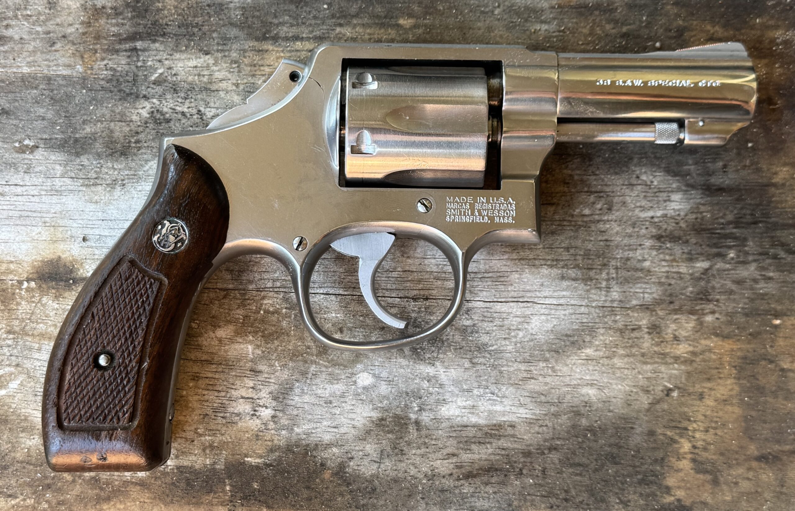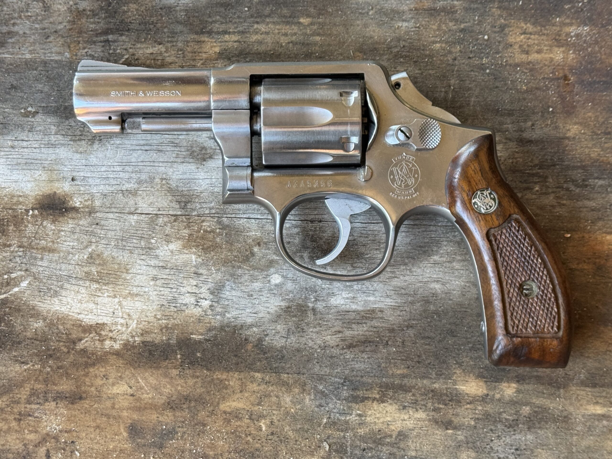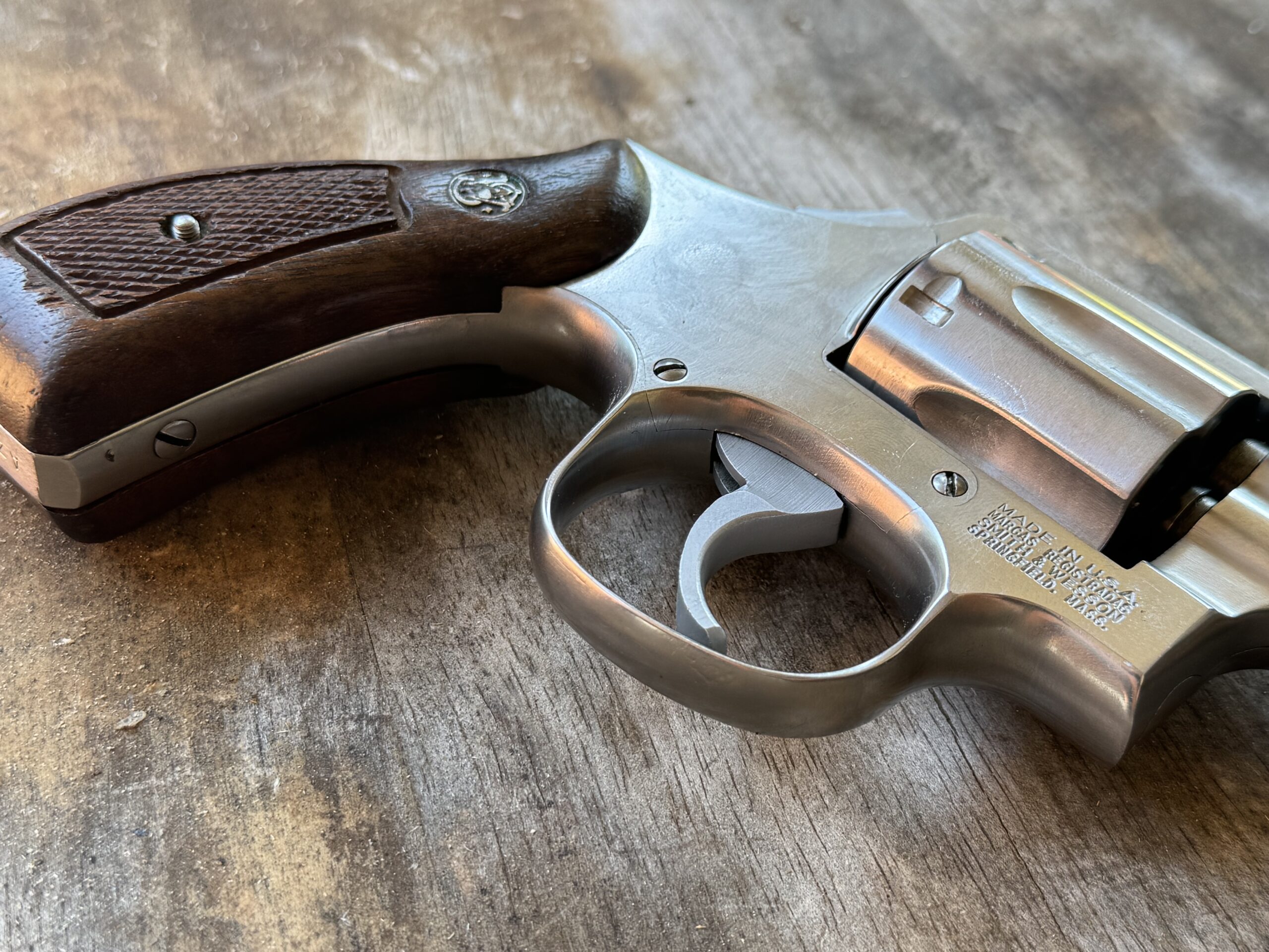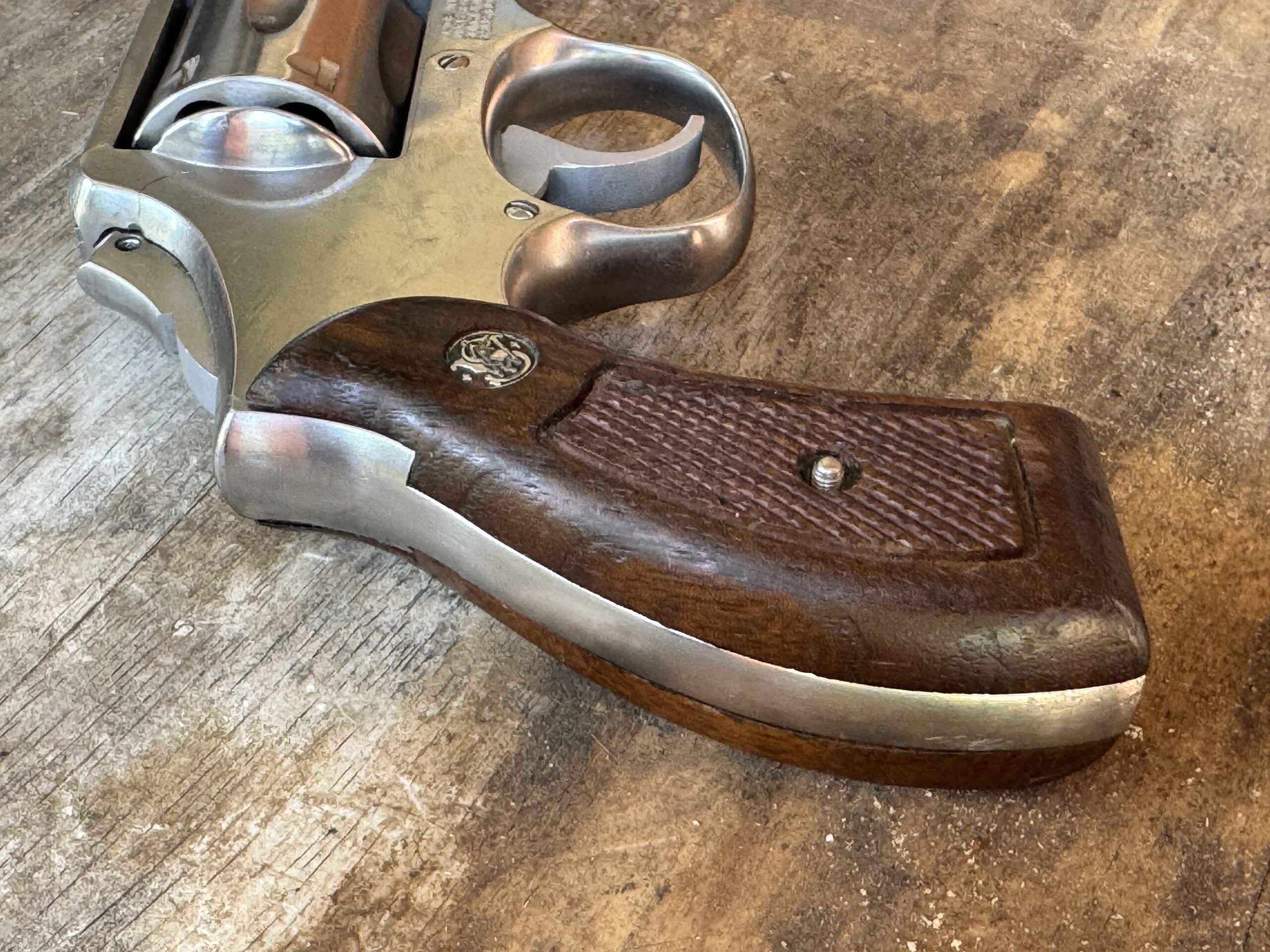 The guns came factory direct from S&W wearing checkered Magna Walnut grips with the S&W Medallion but most officers switched them out for Pachmayr or similar rubber grips.