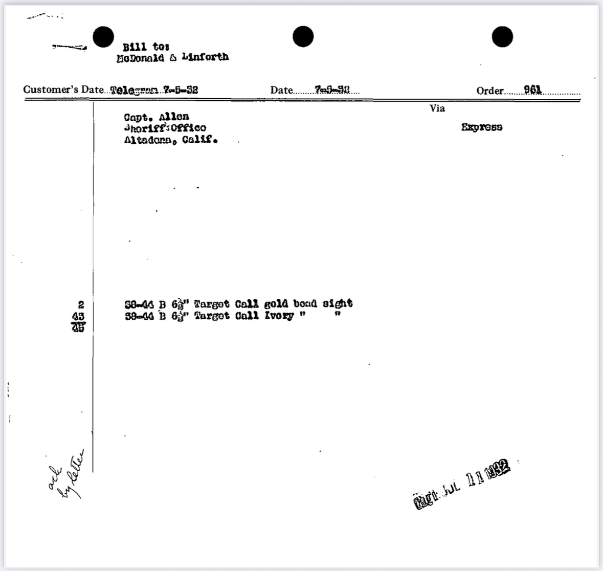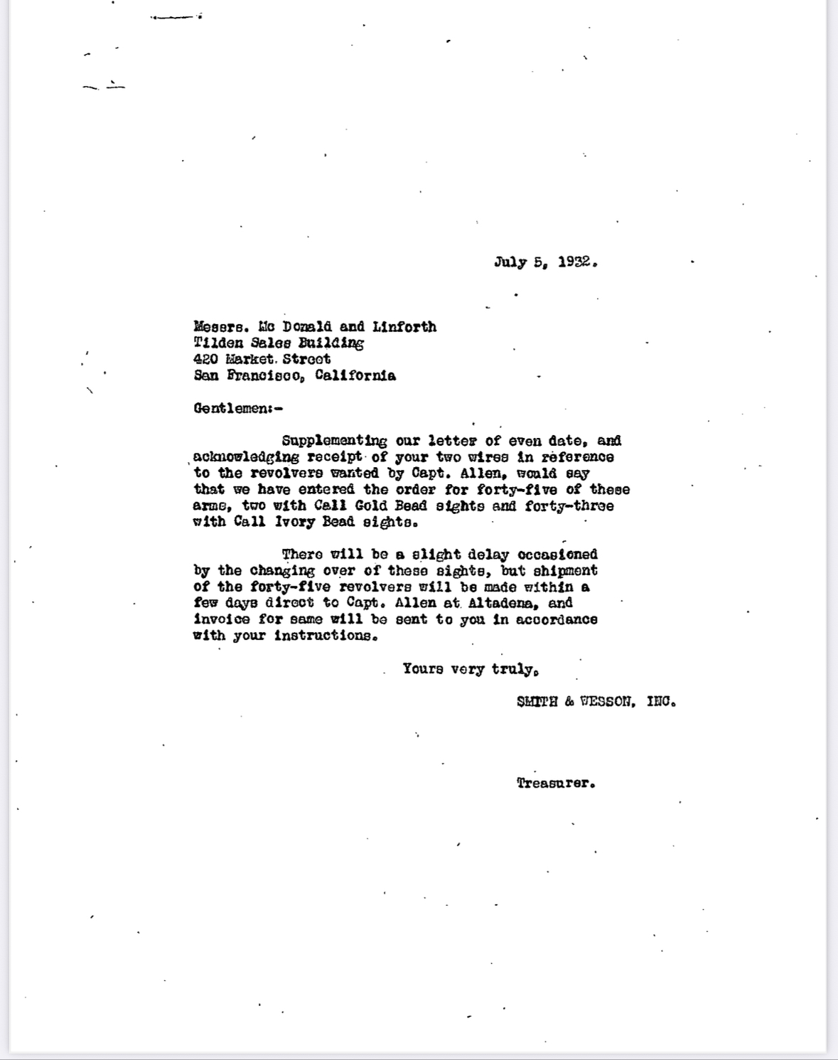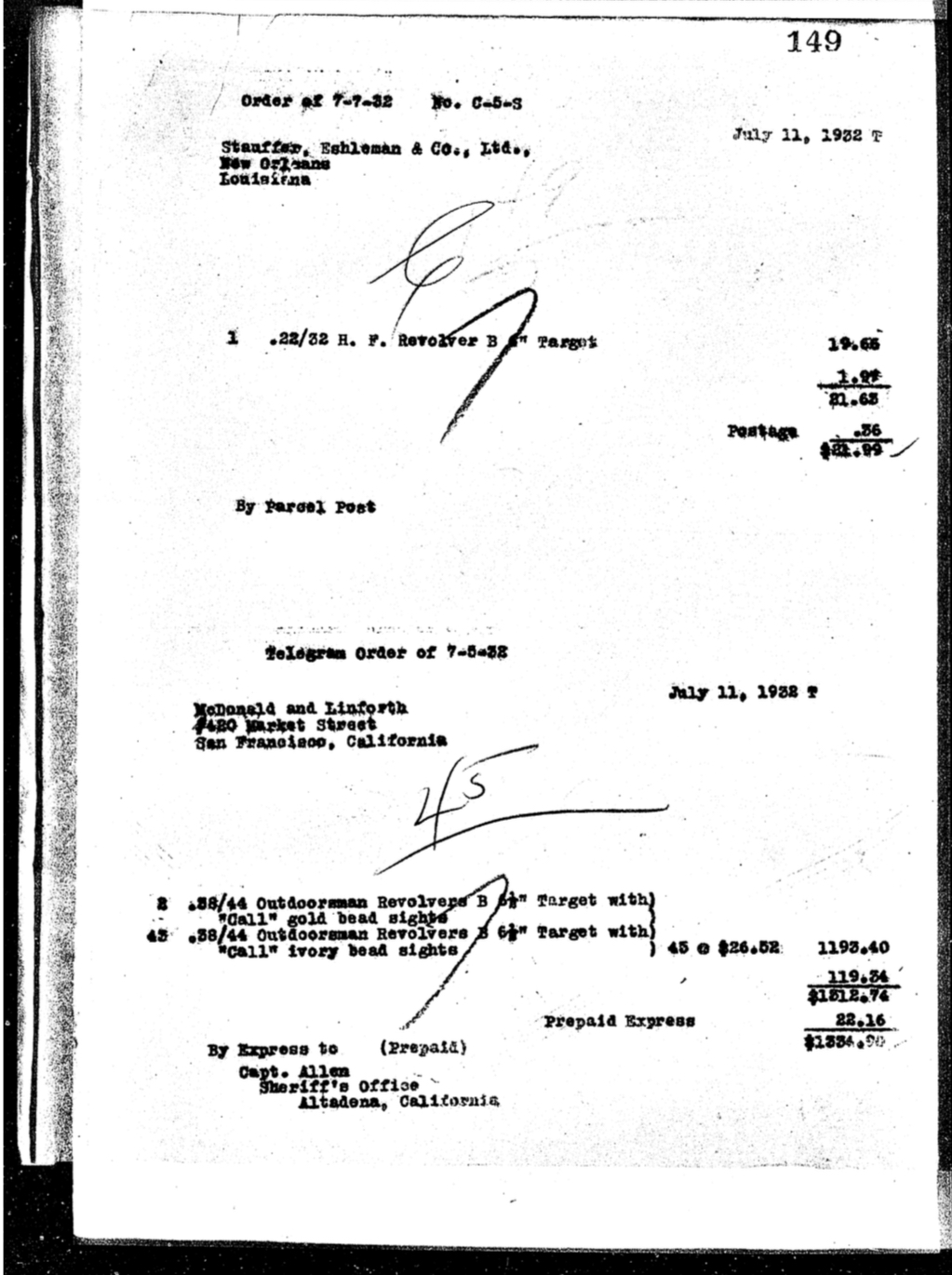 SN 41690 was one of a 45 gun individual officer order put together by Captain Allen. It was shipped July 1932 to Captain Allen at Altadena station LASD.